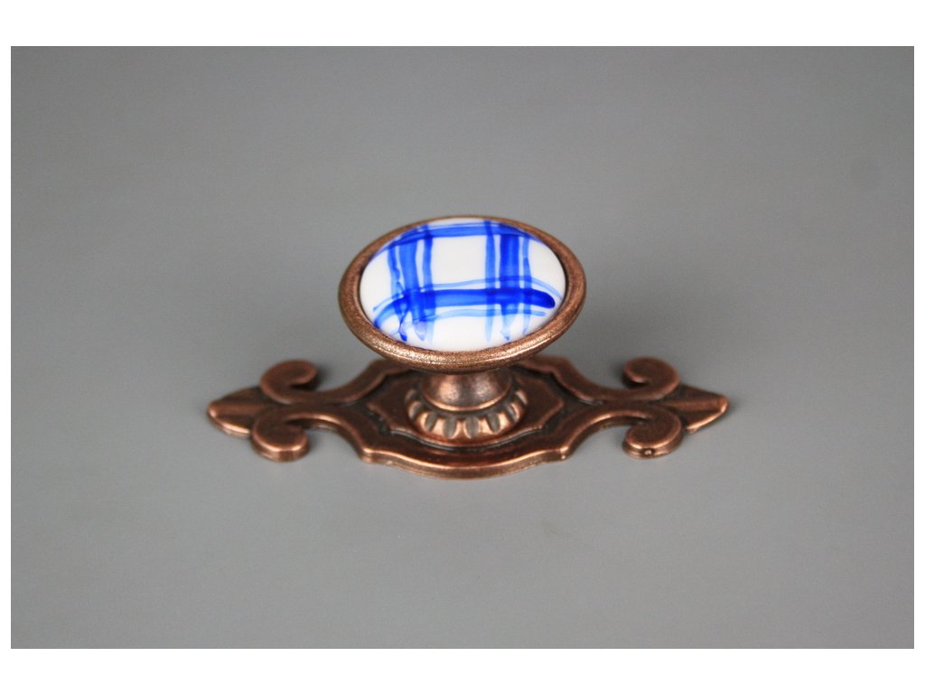 Nádherná rustikální knopka 35mm se štítem 7cm - provedení staroměď (CU) v kombinaci s porcelánem. Jedná se o pravý karlovarský porcelán, nikoliv kameninu, přestože je mnohými výrobci mylně uváděn porcelán, teplota výpalu 820 st. Celsia. Ve spodní části je vrtaný závit M4 hluboký 15mm, součástí dodávky je lámací šroub s půlkulatou hlavou M4x20-45mm.