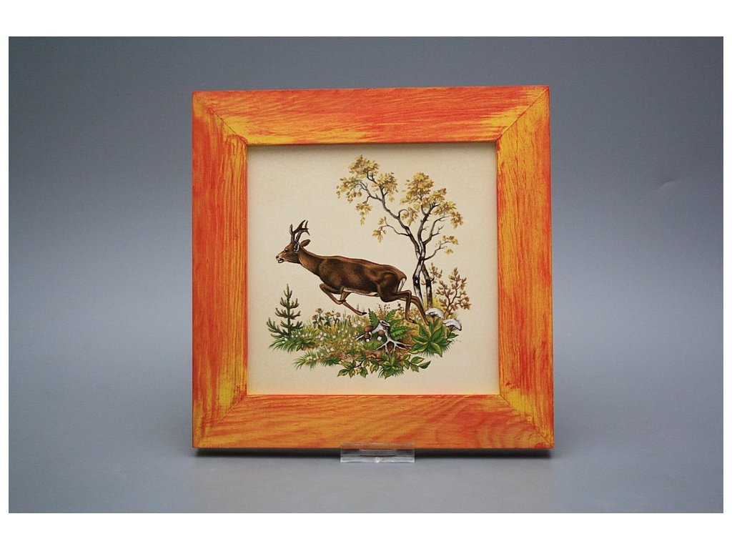 Závěsný keramický obrázek s dřevěným rámečkem, vypalovací teplota motivu 820 st.C., nesmazatelný omyvatelný dekor.