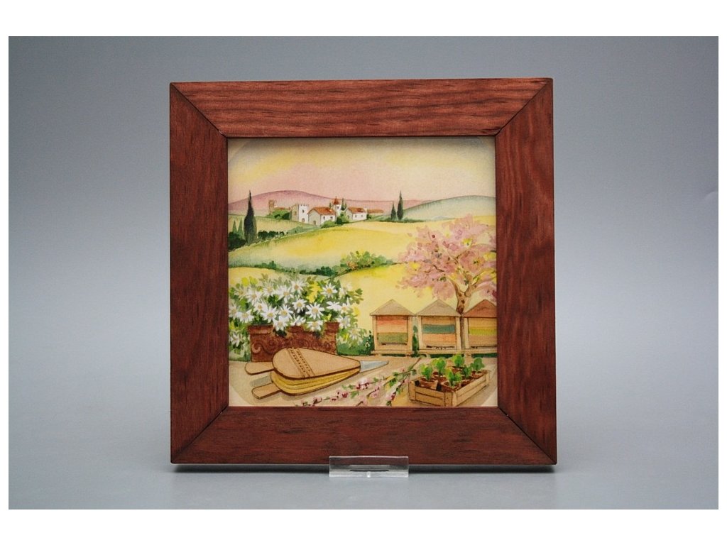 Závěsný keramický obrázek s dřevěným rámečkem, vypalovací teplota motivu 820 st.C., nesmazatelný omyvatelný dekor.
