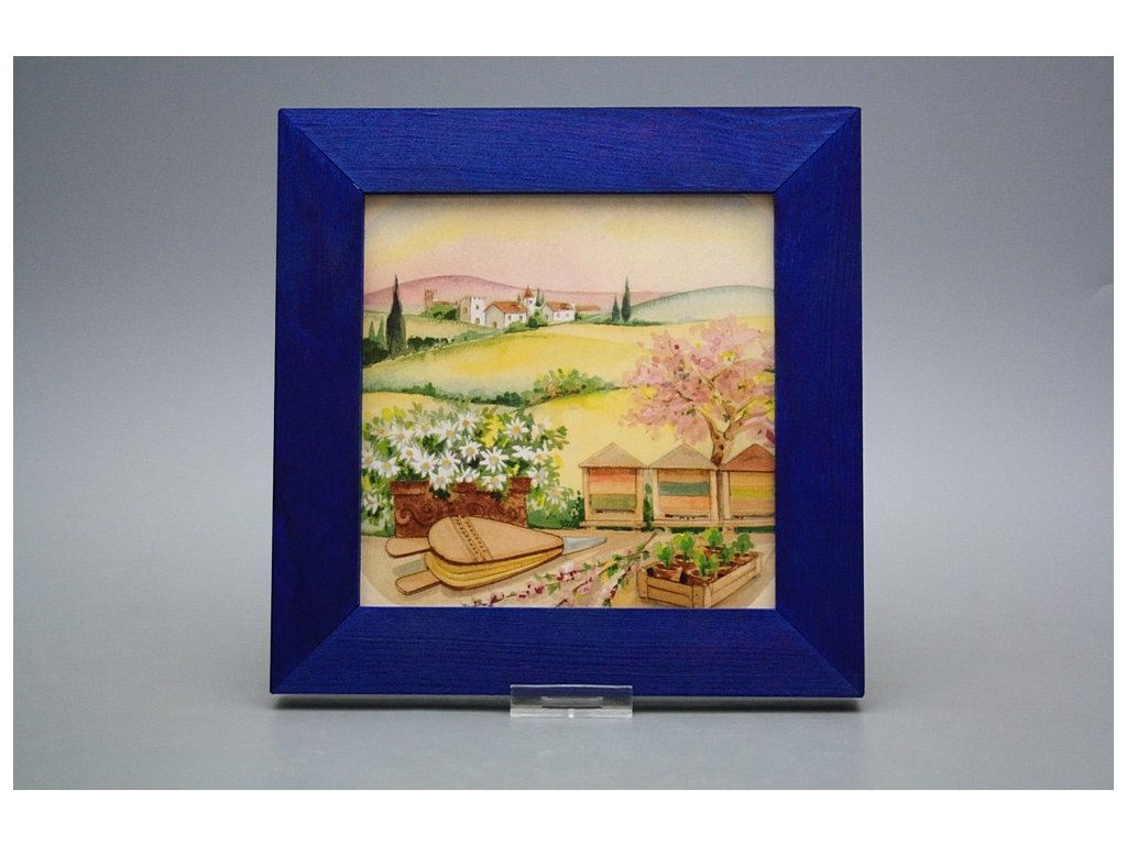 Závěsný keramický obrázek s dřevěným rámečkem, vypalovací teplota motivu 820 st.C., nesmazatelný omyvatelný dekor.