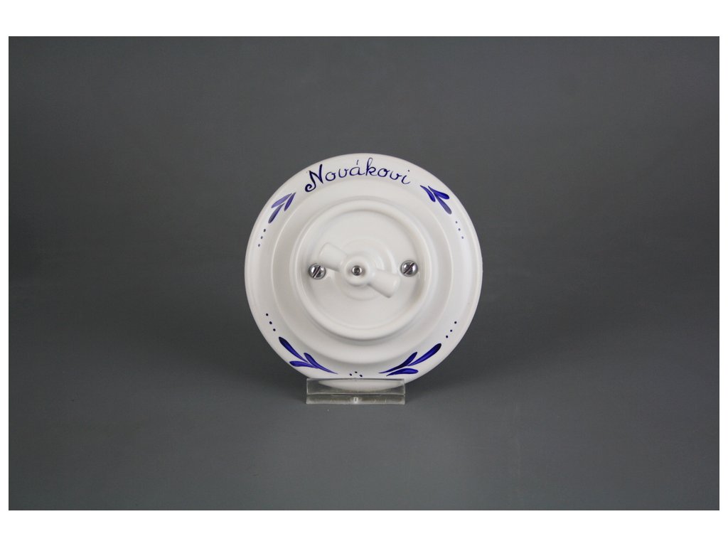 Kompletní ručně vyráběný i ručně malovaný otočný porcelánový vypínač zvonkový v retro stylu se jménem (Vaše příjmení, případně jiné barevné provedení uveďte do Poznámky), kvalitní dekorace s teplotou výpalu 820 st. Celsia. Vypínač je dodáván včetně rámečku a je určen pro instalaci v interiéru do klasických elektroinstalačních krabic např. KP68 - průměr vrtaného otvoru 80mm, hloubka 43mm, pro vícenásobný rámeček je nutno dodržet rozteč středů 71 mm.