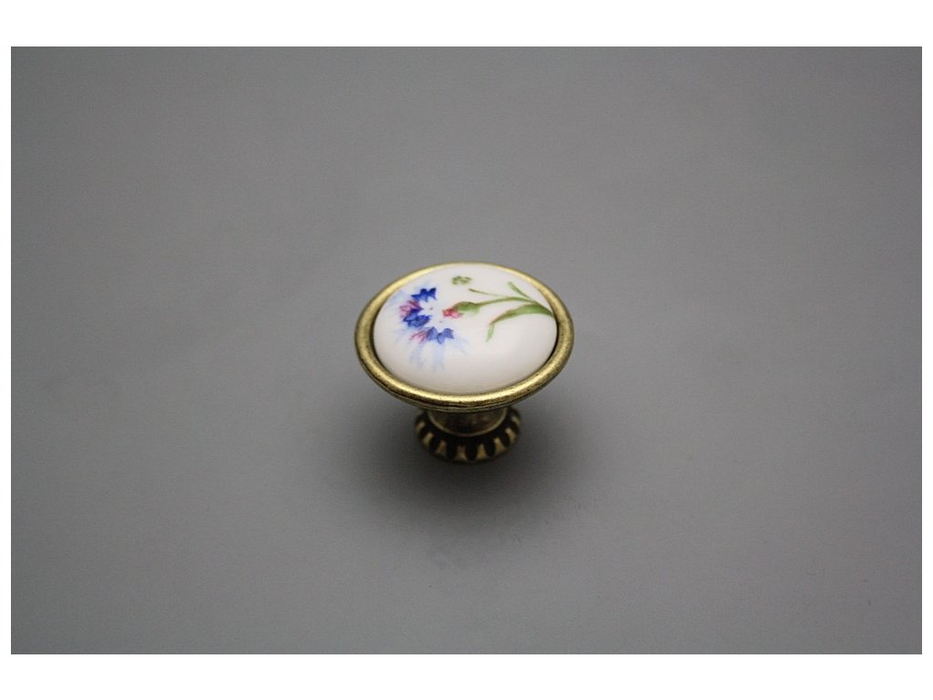 Nádherná rustikální mosazná úchytka - provedení staromosaz v kombinaci s porcelánem. Jedná se o pravý karlovarský porcelán, nikoliv kameninu, přestože je mnohými výrobci mylně uváděn porcelán. Ve spodní části je vrtaný závit M4 hluboký 15mm, součástí dodávky je lámací šroub s půlkulatou hlavou M4x20-45mm.