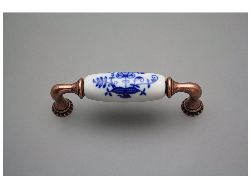 Nádherná kombinovaná rustikální mosazná úchytka - rozteč 96mm, provedení staroměď (CU) v kombinaci s porcelánem cibulák, pravý kobalt (teplota výpalu 1400 st.C, nesmazatelný dekor). Ve spodních částech jsou vrtané závity M4 hluboké 15mm . Součástí dodávky je 2x lámací šroub s půlkulatou hlavou M4x20-45mm.