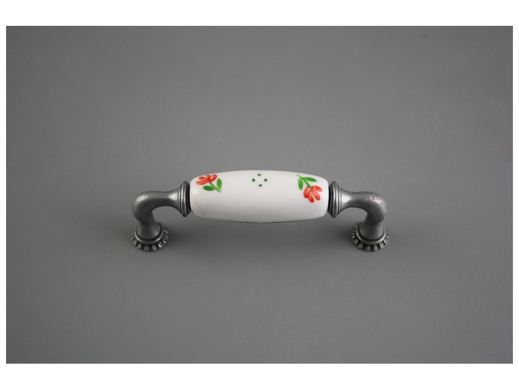 Nádherná kombinovaná rustikální ručně malovaná mosazná úchytka - rozteč 96mm, provedení starostříbro (FV), dekorace porcelánu keramickými barvami s teplotou výpalu 820 st. Celsia - nesmazatelný omyvatelný dekor. Součástí dodávky je 2x lámací šroub s půlkulatou hlavou M4x20-45mm.