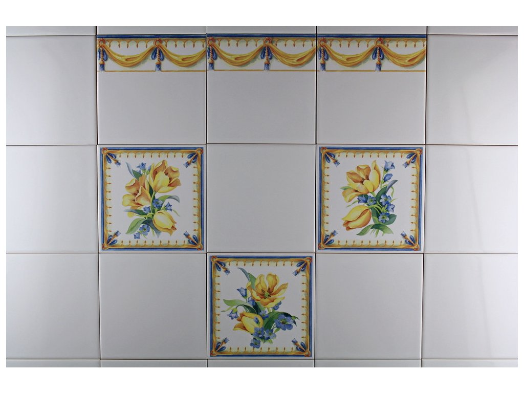 Kvalitní dekorovaný keramický obklad 15x15cm - 3ks v I. jakostní třídě, páleno v komorové peci na teplotu 820 st. Celsia - nesmazatelný omyvatelný dekor. K dekoraci byl použit keramický obklad RAKO COLOR ONE matný bílý, serie COLOR ONE WAA19104.