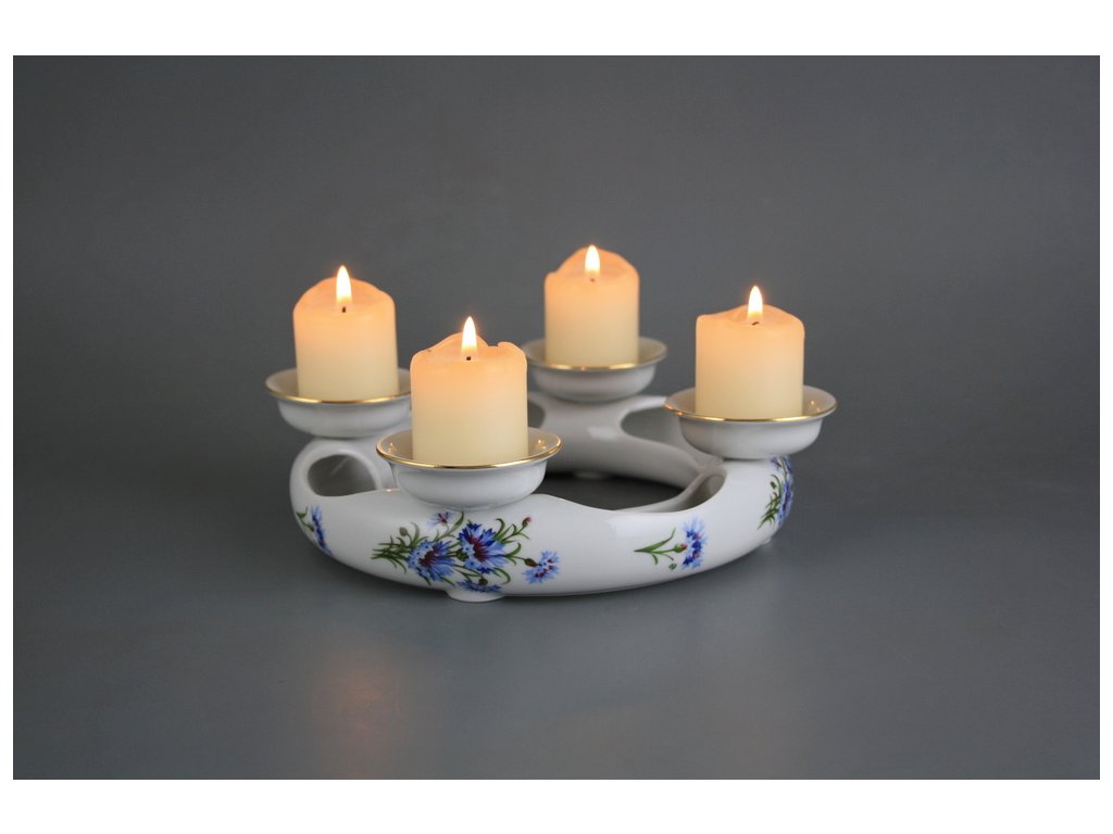 Praktický adventní svícen na 4 svíčky z kvalitního českého porcelánu, dekorace lesklým zlatem. V těle svícnu je prostor pro vodu, je možné aranžovat i živé květiny. Nevhodný do myčky.