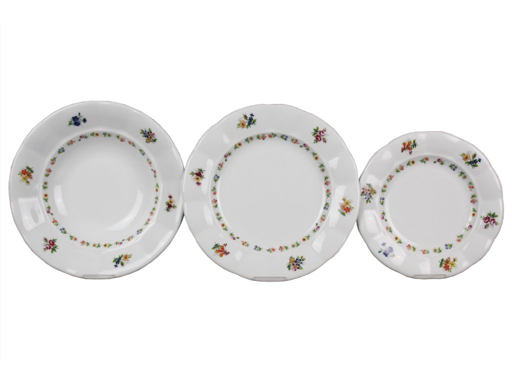 Praktická 36dílná talířová souprava z kvalitního českého porcelánu. Vhodná do myčky i mikrovlnné trouby.