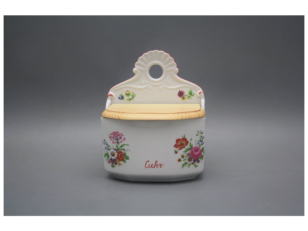 Praktická závěsná cukřenka s dřevěným víkem z kvalitního českého porcelánu.